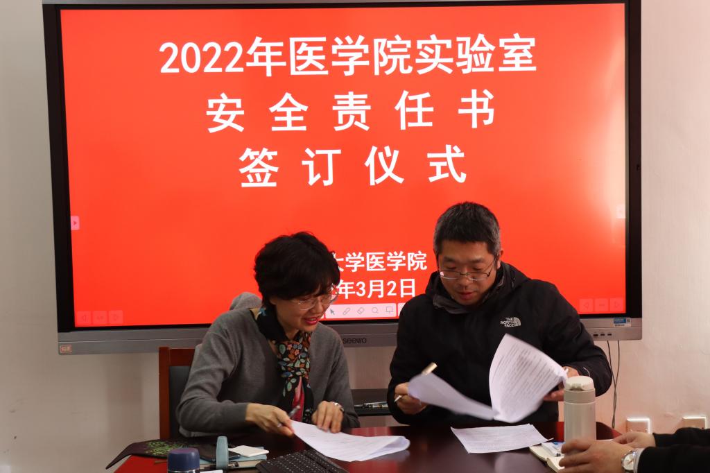 在签订仪式中,医学院执行院长、分管实验室工作副院长、基础医学院和公共卫生学院执行院长、各学系主任、各办公室和中心负责人按照各自岗位职责一一签订了《实验室安全责任书》。