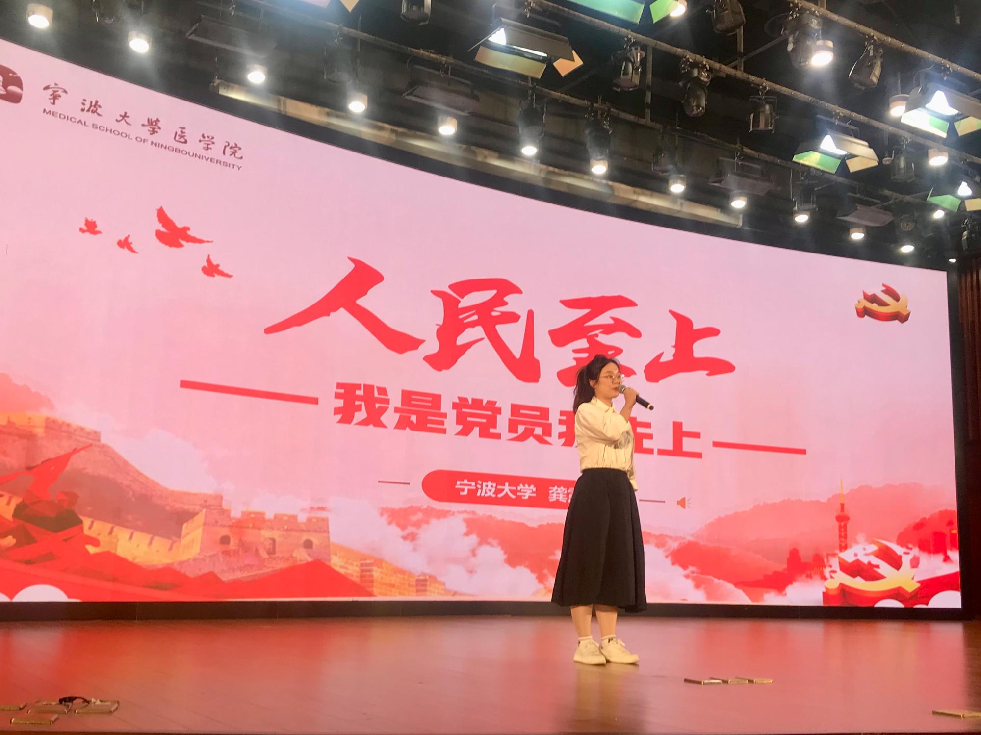 学生第五党支部龚露芸以《人民至上,我是党员我先上》为题,讲述了抗击新冠肺炎疫情期间医护人员奋战在一线“人民至上”的故事,并结合自己亲身经历的镇海疫情,对“人民至上,生命至上”阐述了自己深层次的见解。