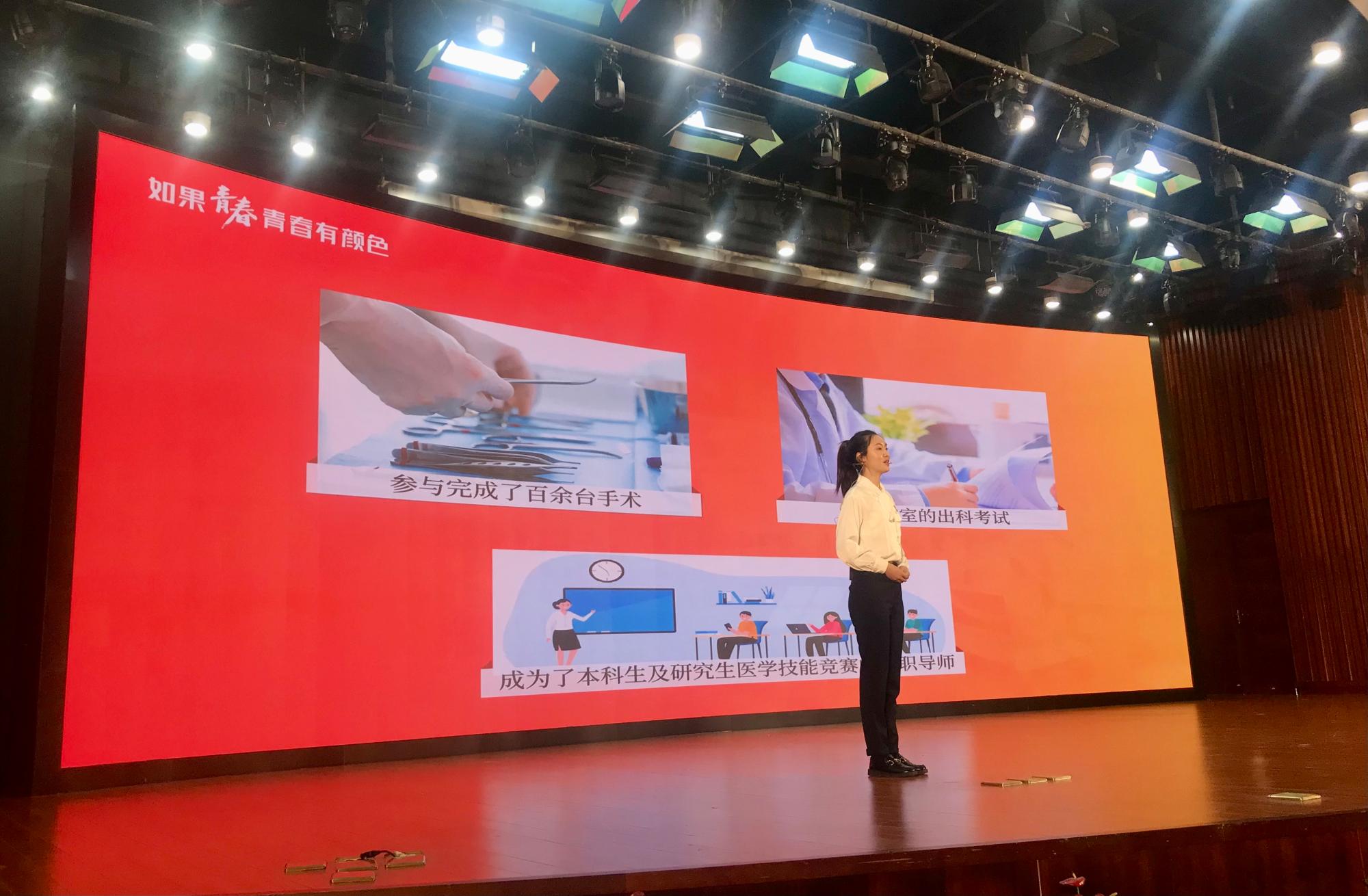 研究生第二党支部王舒丹以《如果青春有颜色》为题,从白色、蓝色、红色三个底色分别讲述了医学生的白大褂、无菌服、红马甲背后的故事,并用自己的经历激励更多的青年矢志不渝奋斗,奋力担当作为,在飞扬的青春里描绘属于自己的青春色彩。