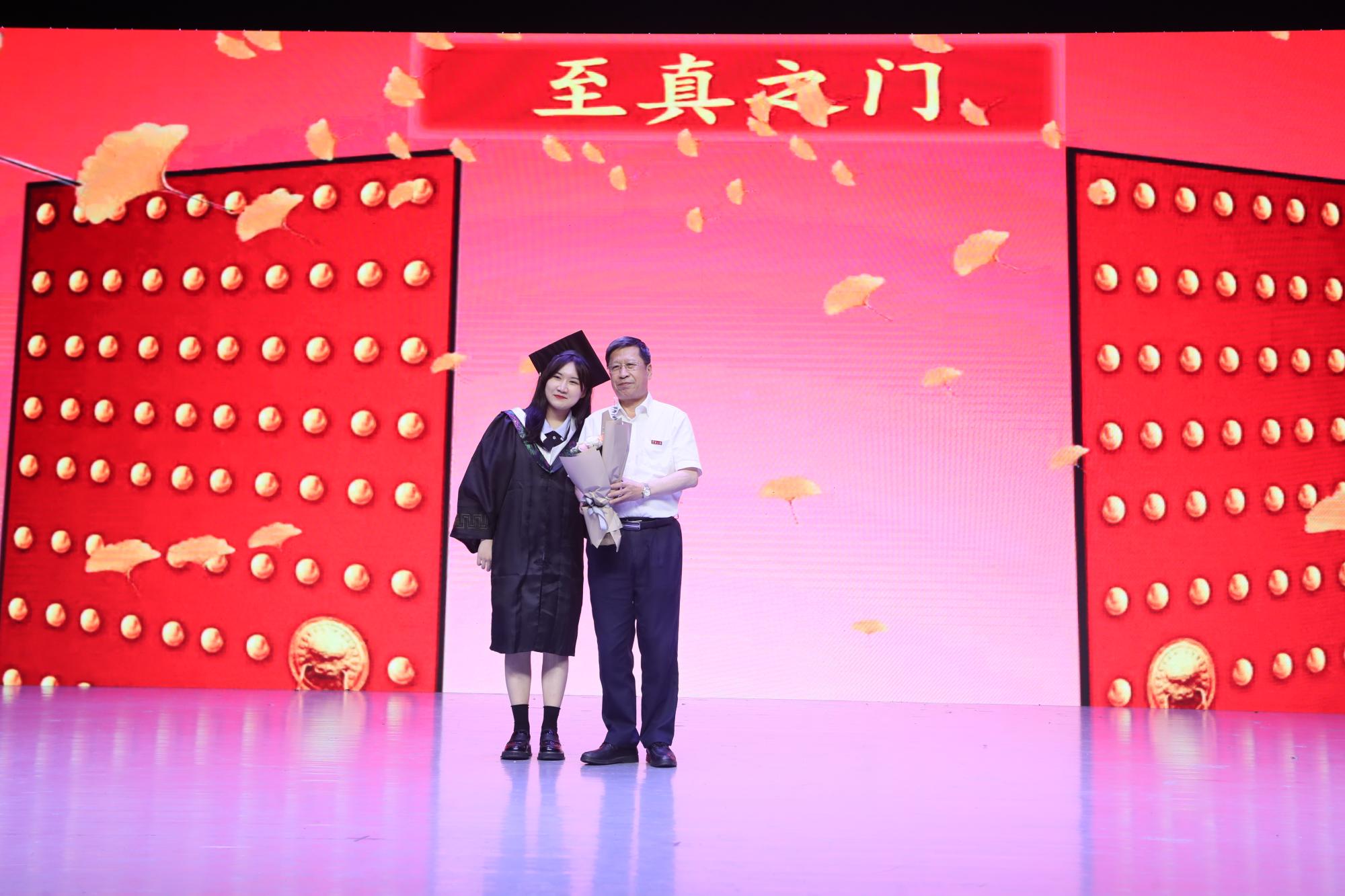 走出至真之门的环节,70名毕业生代表向与会的70多位老师一一献花致意,携手走出至真之门。入门与出门,入学与毕业,至真之门承载着同学们的青春年华,也承载着毕业生对老师们的感恩之情以及老师对学子们的欣慰与期望。