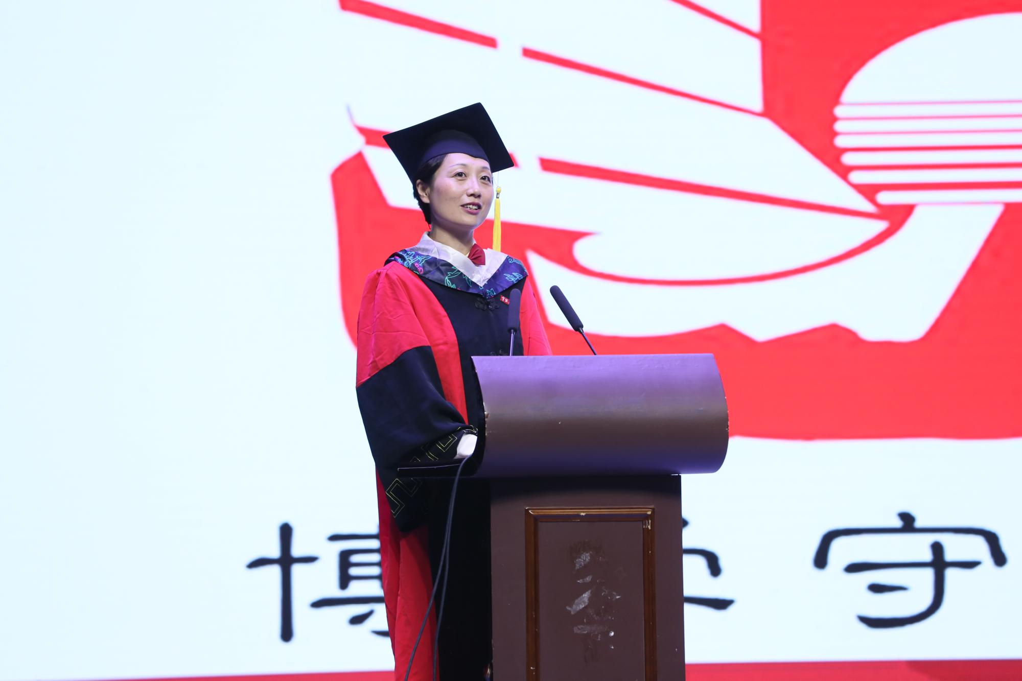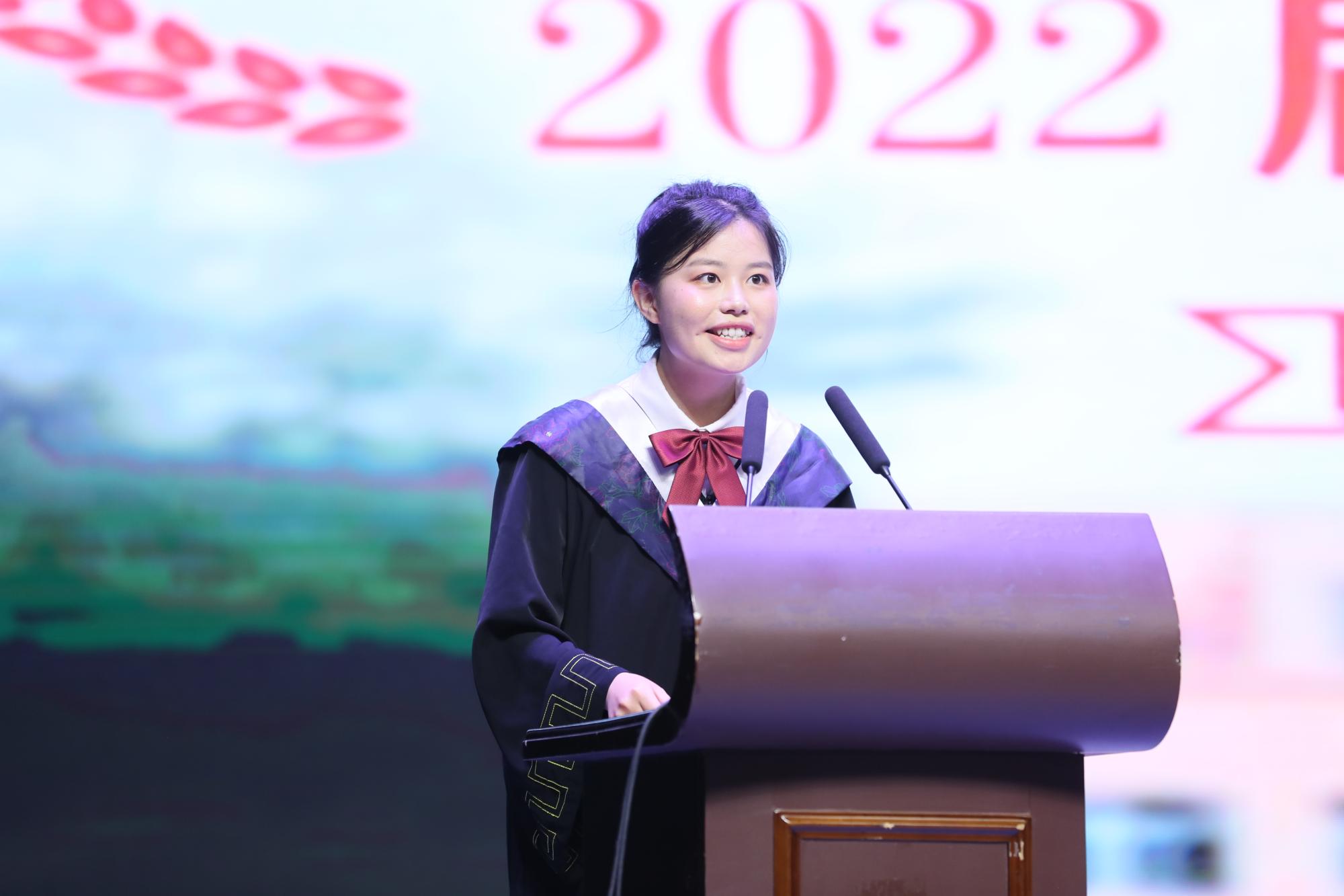 研究生严嘉宁、本科生胡景岑分别代表全体研究生、本科生发言。他们满怀深情地表达了对学校、学院的感恩之情,并分享了自己在求学生涯中的酸甜苦辣,收获时不露圭角,失去时不惧回声,奋力拼搏的他们用实际行动树立了前进的榜样。