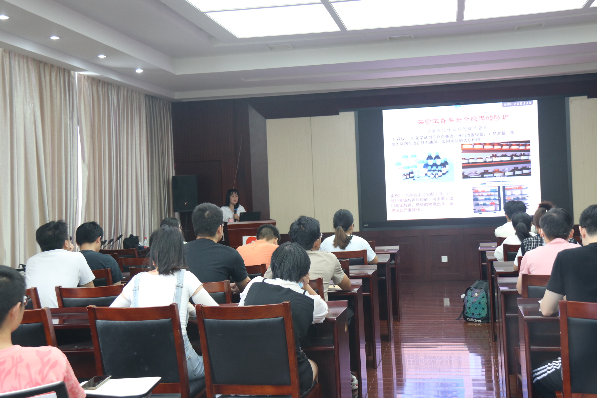 9月16日上午,医学院在王长来楼二楼多功能厅举办实验室安全教育培训会。学院2021级和2022级部分研究生、相关本科生代表合计70余人参加了本次培训。