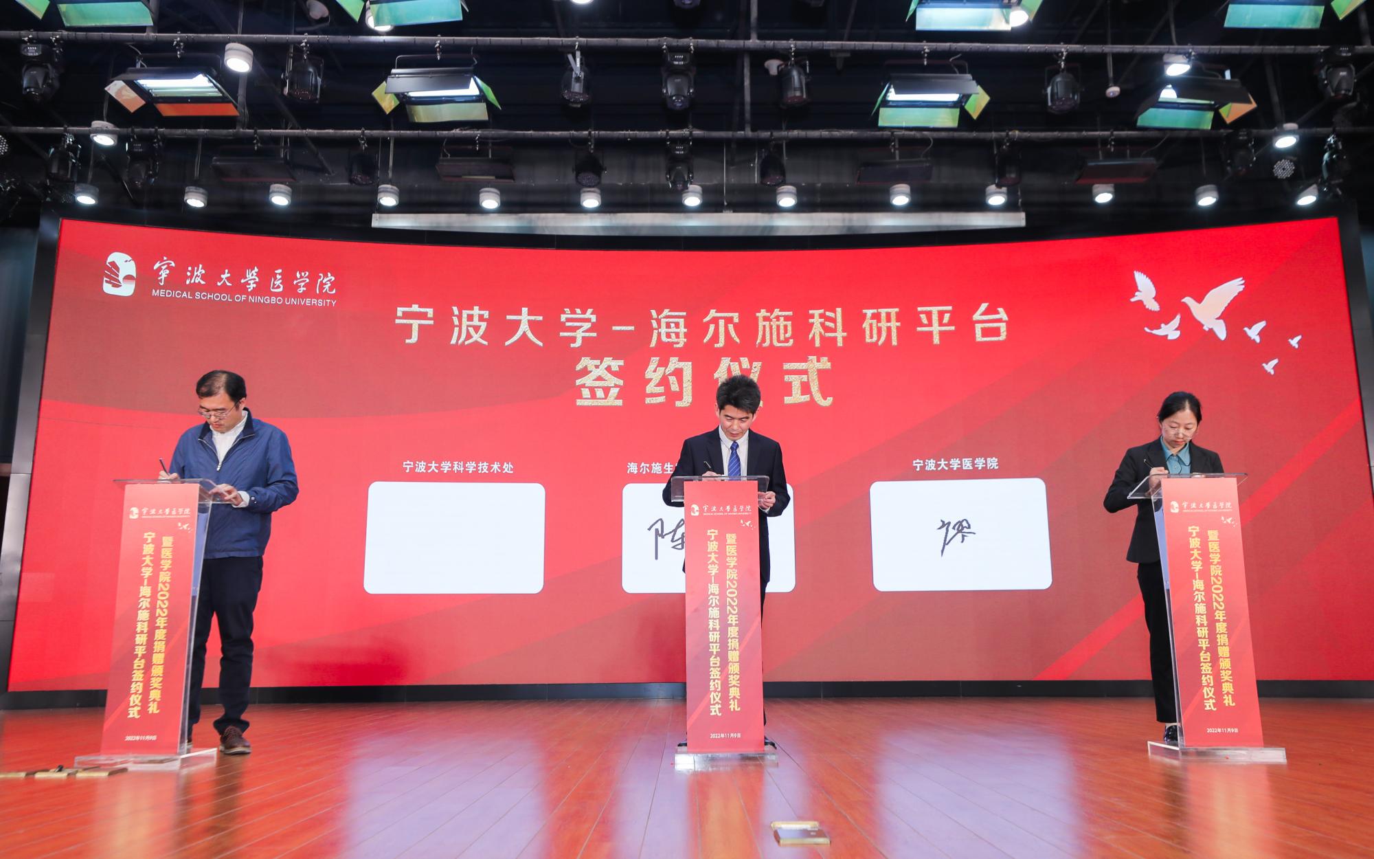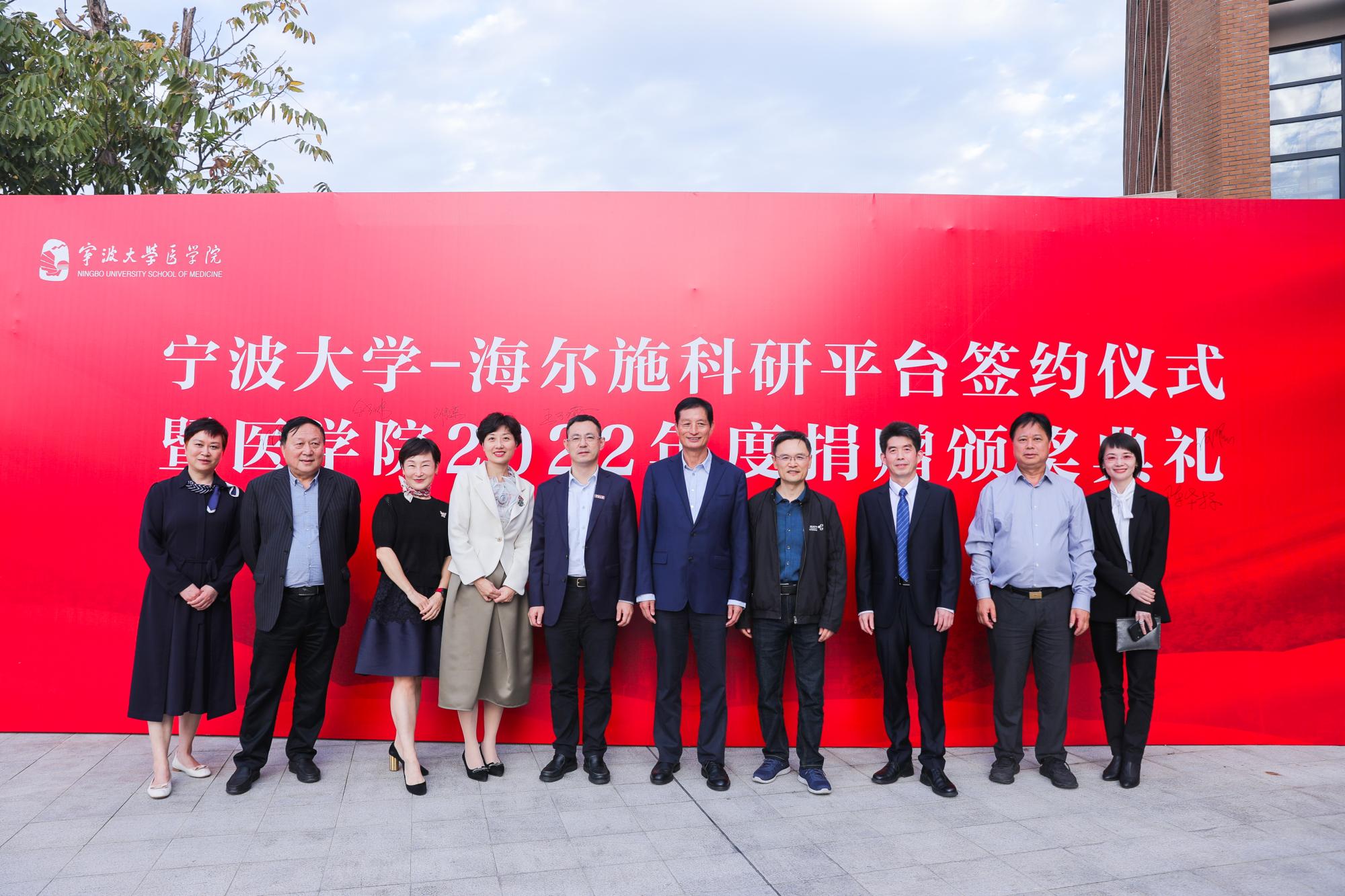 11月9日,色花堂 -海尔施科研平台签约仪式暨医学院2022年度捐赠颁奖典礼在真诚图书馆报告厅顺利举行。海尔施生物医药股份有限公司董事长余剑伟、副总裁王子瑜,香港江兴国际投资有限公司董事长江兴浩、宏达货运储柜有限责任公司董事长陆汉幸、宁波中营能源集团有限公司董事长刘康荣、舍力(宁波)供应链管理有限公司董事长何翟等嘉宾参加典礼、校党委副书记童晓晖出席典礼并讲话。