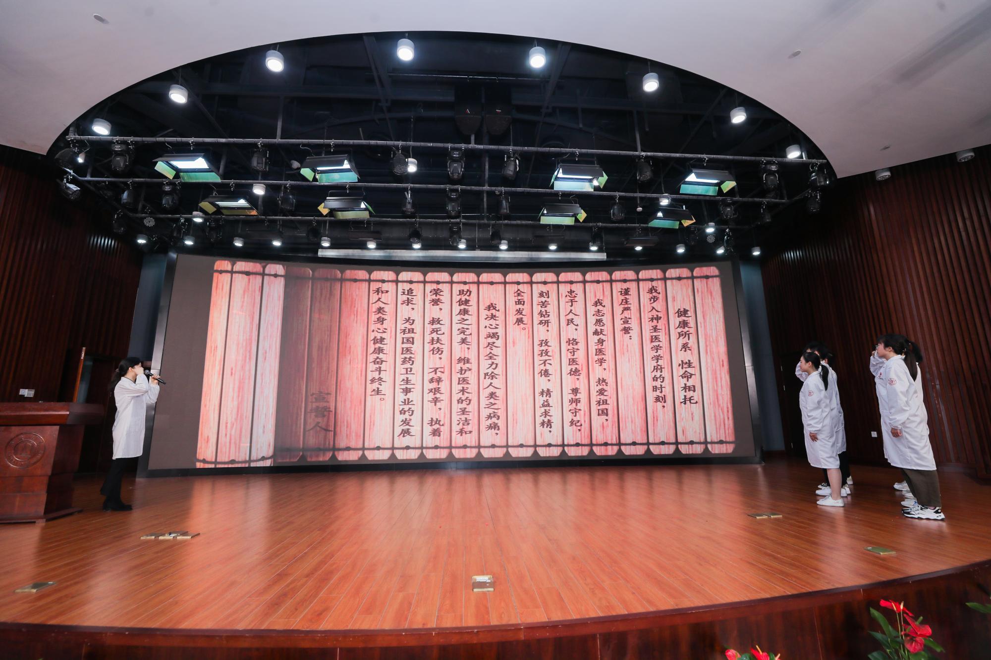活动现场,2022级医学新生在色花堂 附属人民医院临床教师、省教师技能大赛一等奖获得者边佳老师带领下,进行医学誓言宣誓。