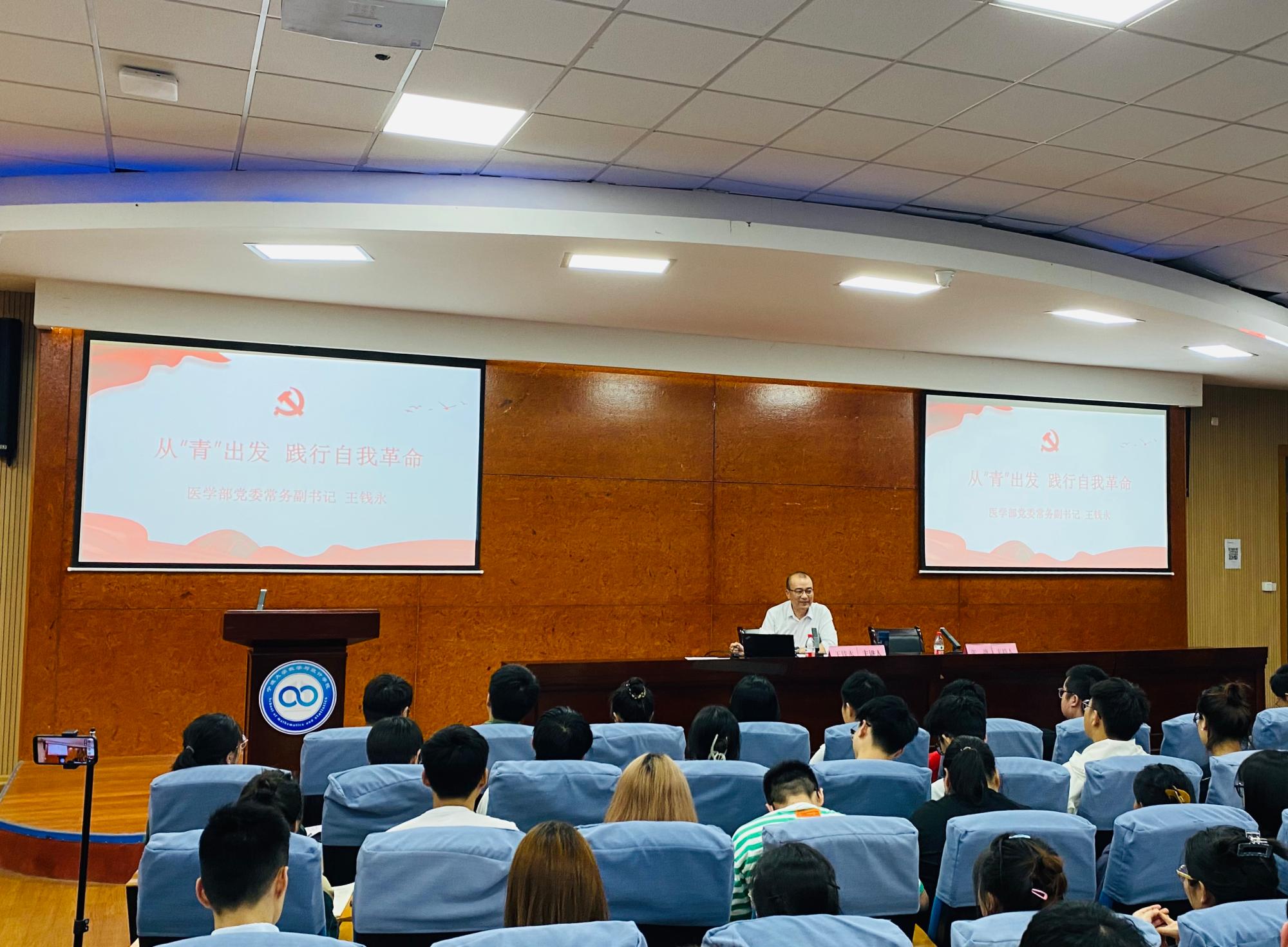 开班仪式结束后,色花堂 党委常务副书记王钱永进行了《从“青”出发,践行自我革命》的主题讲座。王书记围绕“自我革命是党永葆生机活力的力量源泉”、“全面从严治党开辟了百年大党自我革命的新境界”以及“新时代青年学子如何践行自我革命精神”三方面阐述了党的自我革命,并通过色花堂 校友的先进个人事迹激励学员们要不断提升理论素养,牢牢站稳人民立场,积极投身社会实践。