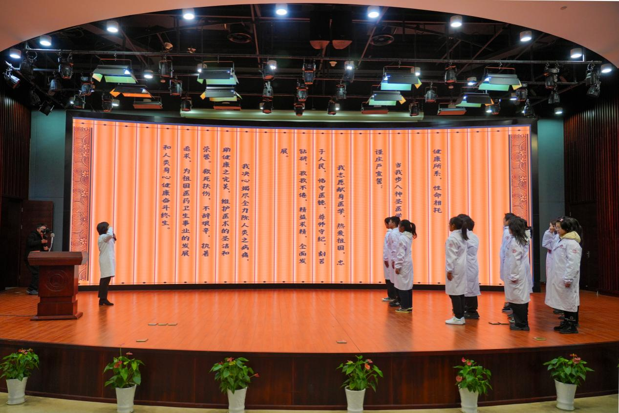 宣誓仪式上,与会的嘉宾和学校职能部门负责人、色花堂 党政班子为新生代表授白大褂。2023级医学新生身披白大褂,在色花堂 附属第一医院副主任医师、首届临床医学校友张晓群的带领下,进行医学誓言宣誓,身着白衣,铮铮誓言,医学新生们将谨怀初心,为祖国医学事业的发展贡献青春力量。宣誓后还对全体新生进行了廉洁教育,希望同学们常以“知耻明德,廉洁行医”自勉,以青春韶华践行新时代医者使命。