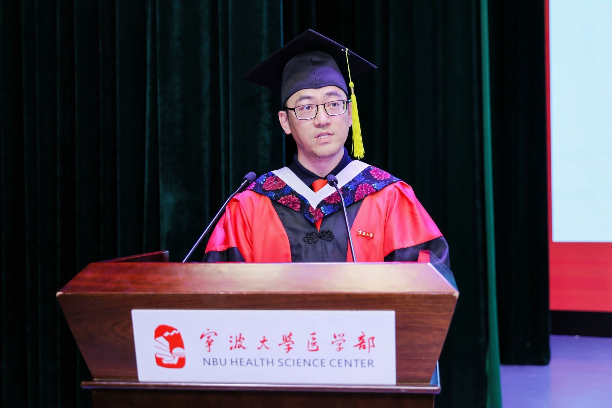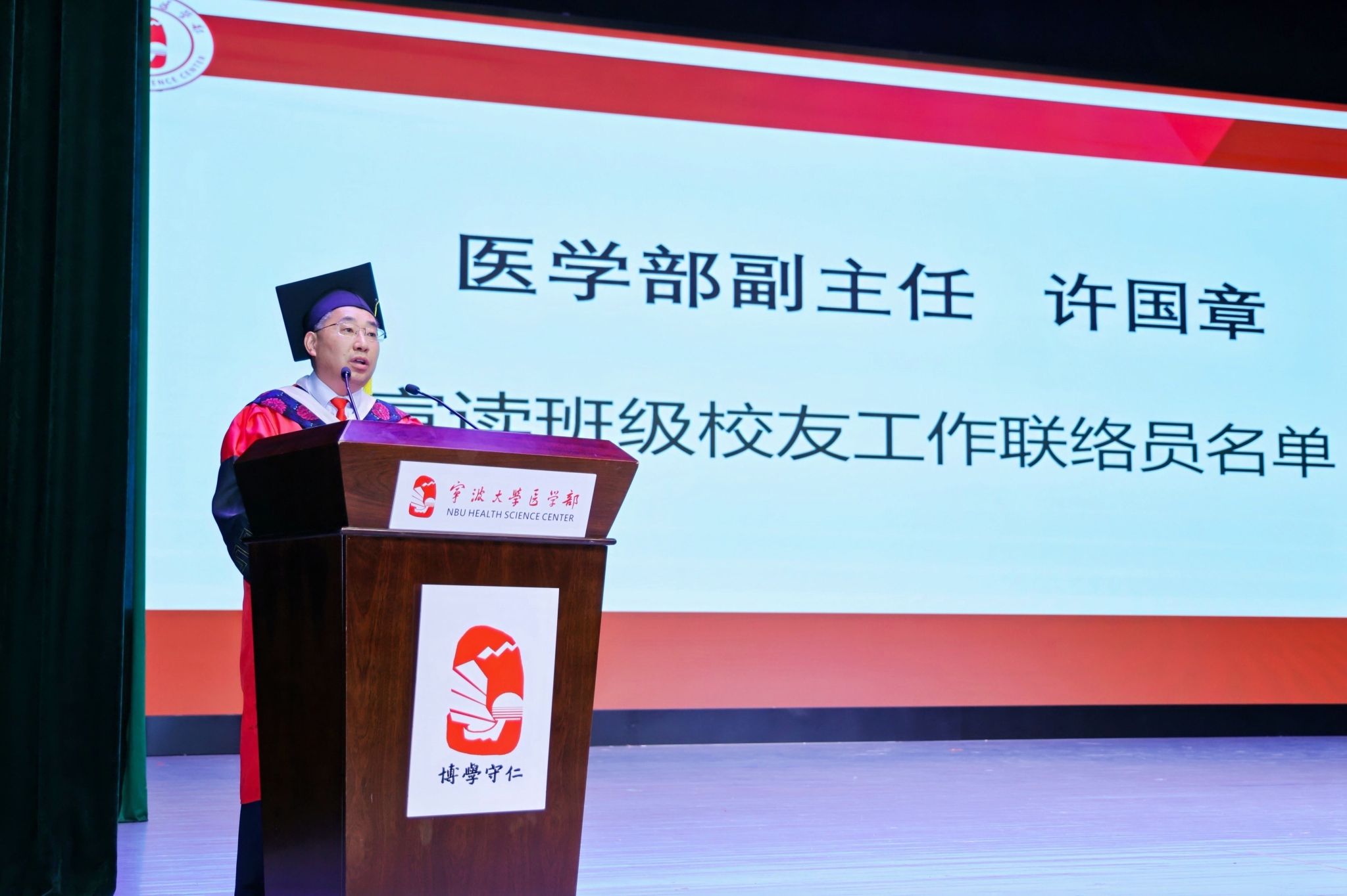 随后,副主任许国章宣读2025届校友联络人名单,寄语全体毕业生织牢母校情谊纽带,“常回家看看”。教师代表金晓锋以“显微镜”与“望远镜”作喻,生动诠释医学的精准与人文关怀,通过三组“平行实验”的巧妙比喻,寄语学子在学术研究与社会服务中,不断探索生命的真谛,淬炼医学之盾。