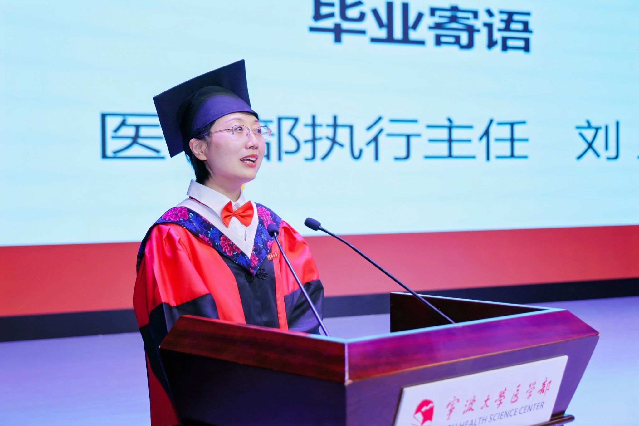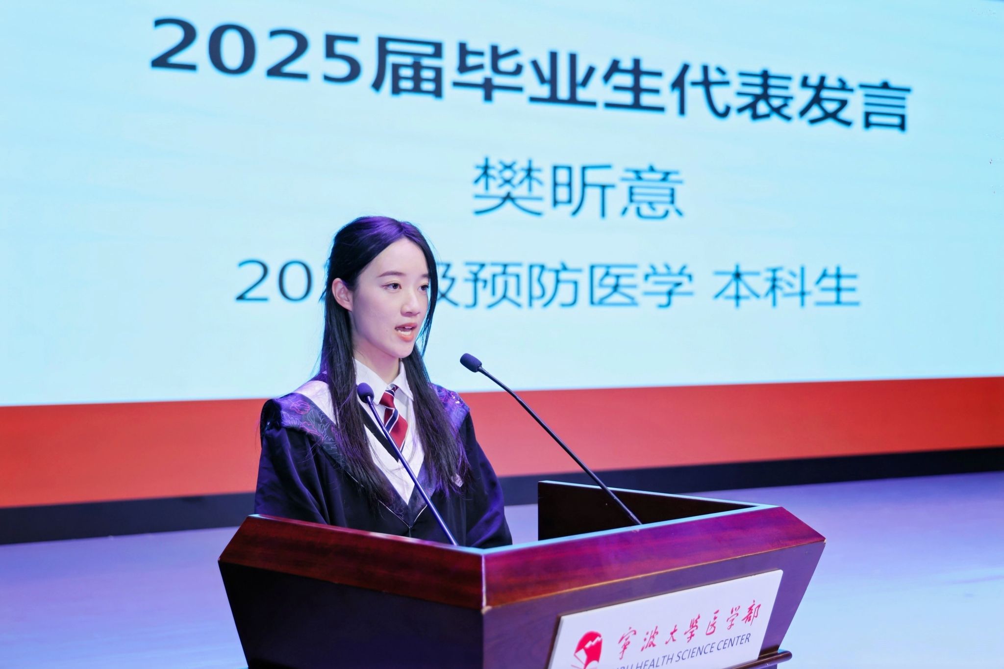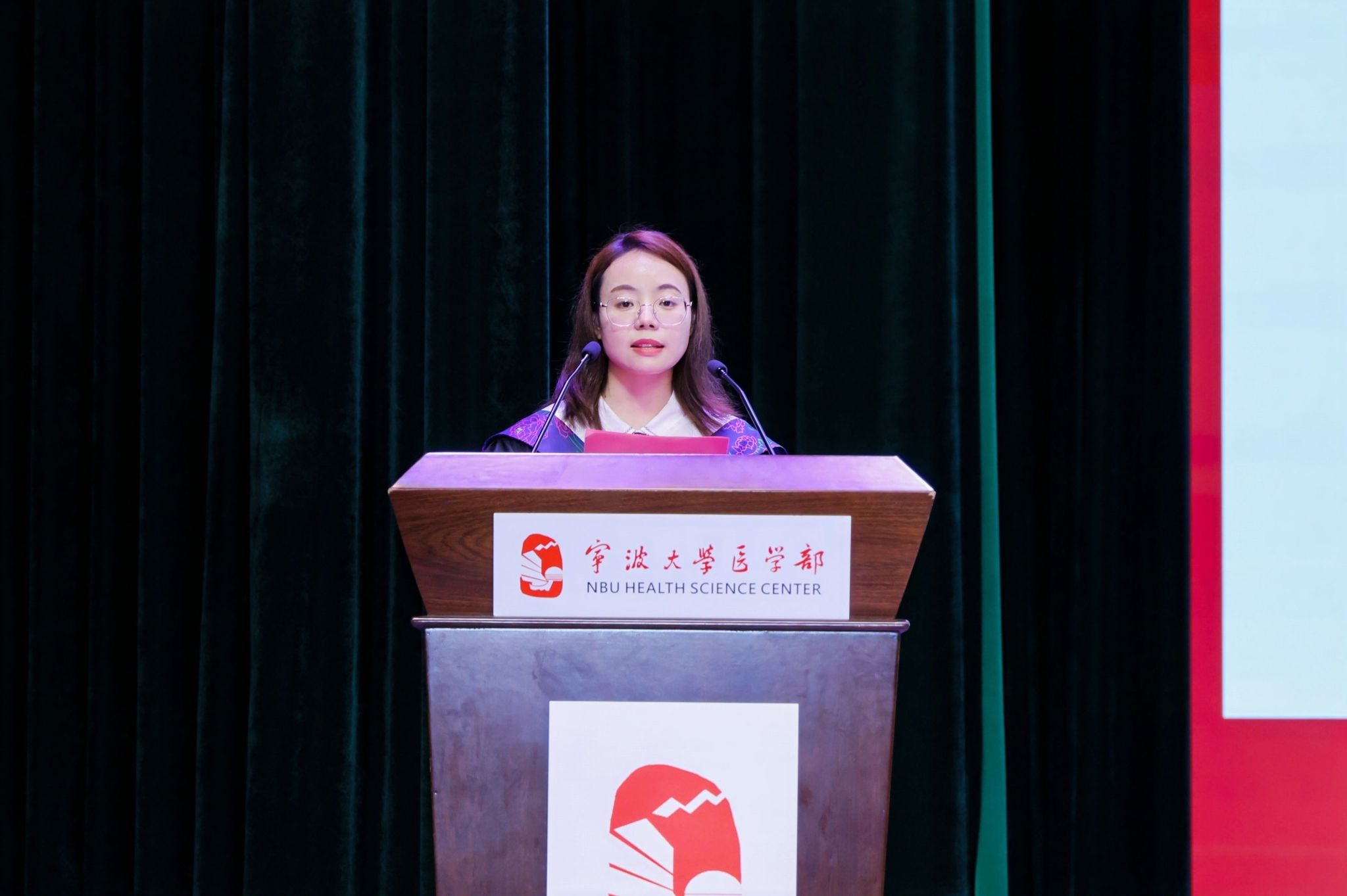 在毕业生代表发言环节,博士毕业生代表朱汇分享了从护理学跨界至预防医学、临床医学的求索之路。“梦想非终点,是将每次‘失去’转化为重新出发的‘获得’。本科生樊昕意回溯了课堂苦读、临床见习的成长点滴,誓言“以党员赤诚守护人民健康”。