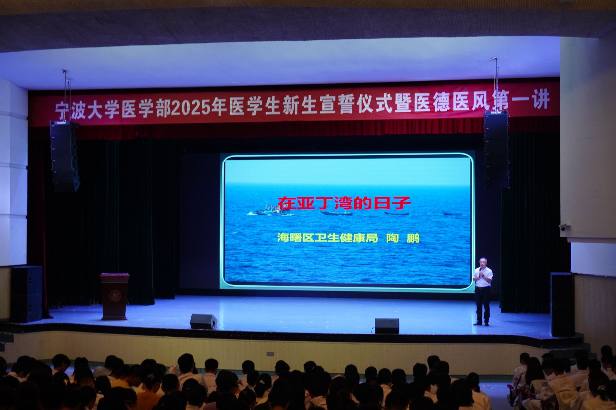 在随后举行的“杏林文化节医德医风第一讲”中,海曙区卫生健康局党委委员陶鹏应邀作了《在亚丁湾的日子》的主题报告,分享了他远赴亚丁湾执行医疗任务的特殊经历。他以亲身经历讲述了在艰苦环境中坚守岗位、履行军人使命的感人故事,重点强调了在枯燥与压力之磨砺出的乐观主义精神、深厚的家国情怀,以及跨越国界实施护航任务所展现的国际人道主义精神。通过对那段特殊岁月的回顾,陶鹏向全体新生提出殷切期望:弘扬爱国主义精神,刻苦钻研医学知识,积极培养综合素养,不断提升服务能力,在未来的从医道路上,始终怀揣仁心、勇担使命。