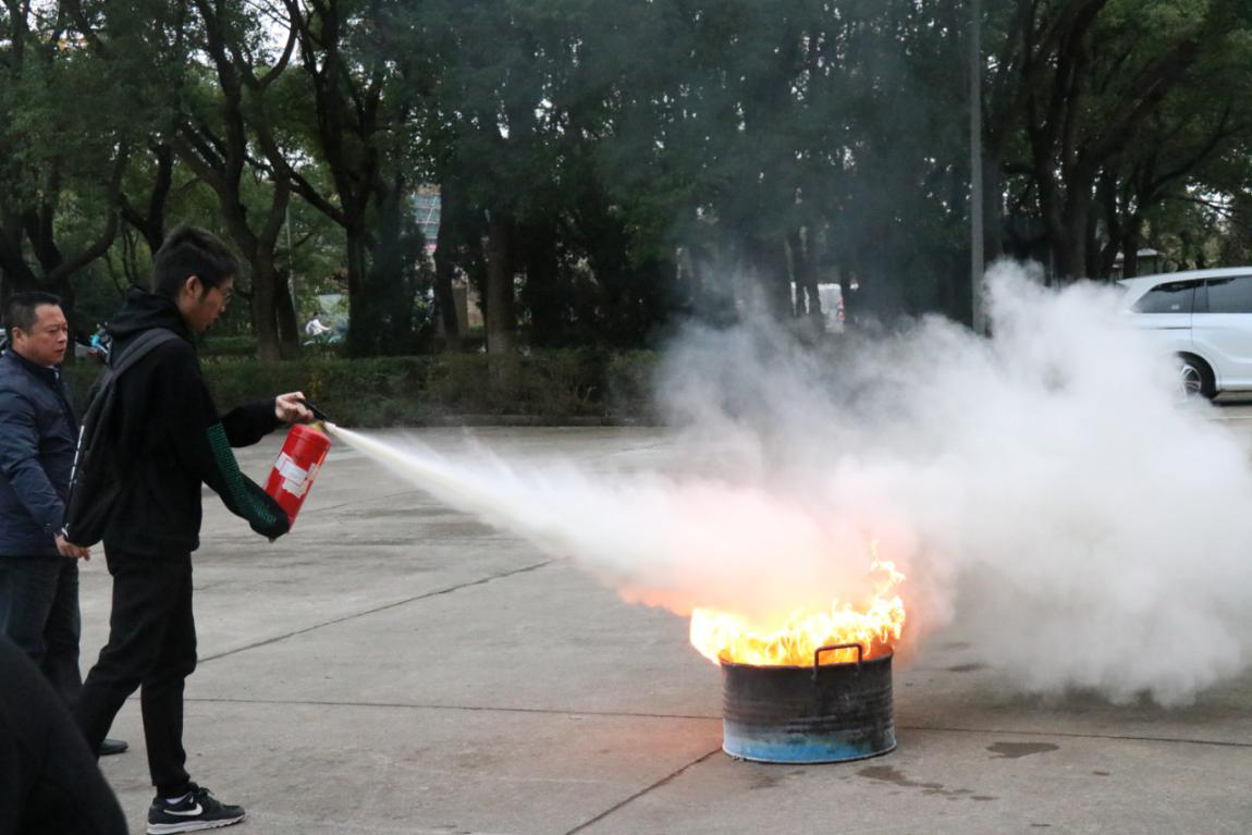 保卫处老师向大家详细讲解了消防安全注意事项,科普了消防安全基础知识,重点讲解了灭火器的构造、使用方法、灭火操作步骤和禁忌事项等。本次安全演习使用的是较常用的干粉灭火器,随后在保卫处老师的指导下,师生们轮流按要求实践操作正确使用灭火器进行灭火。