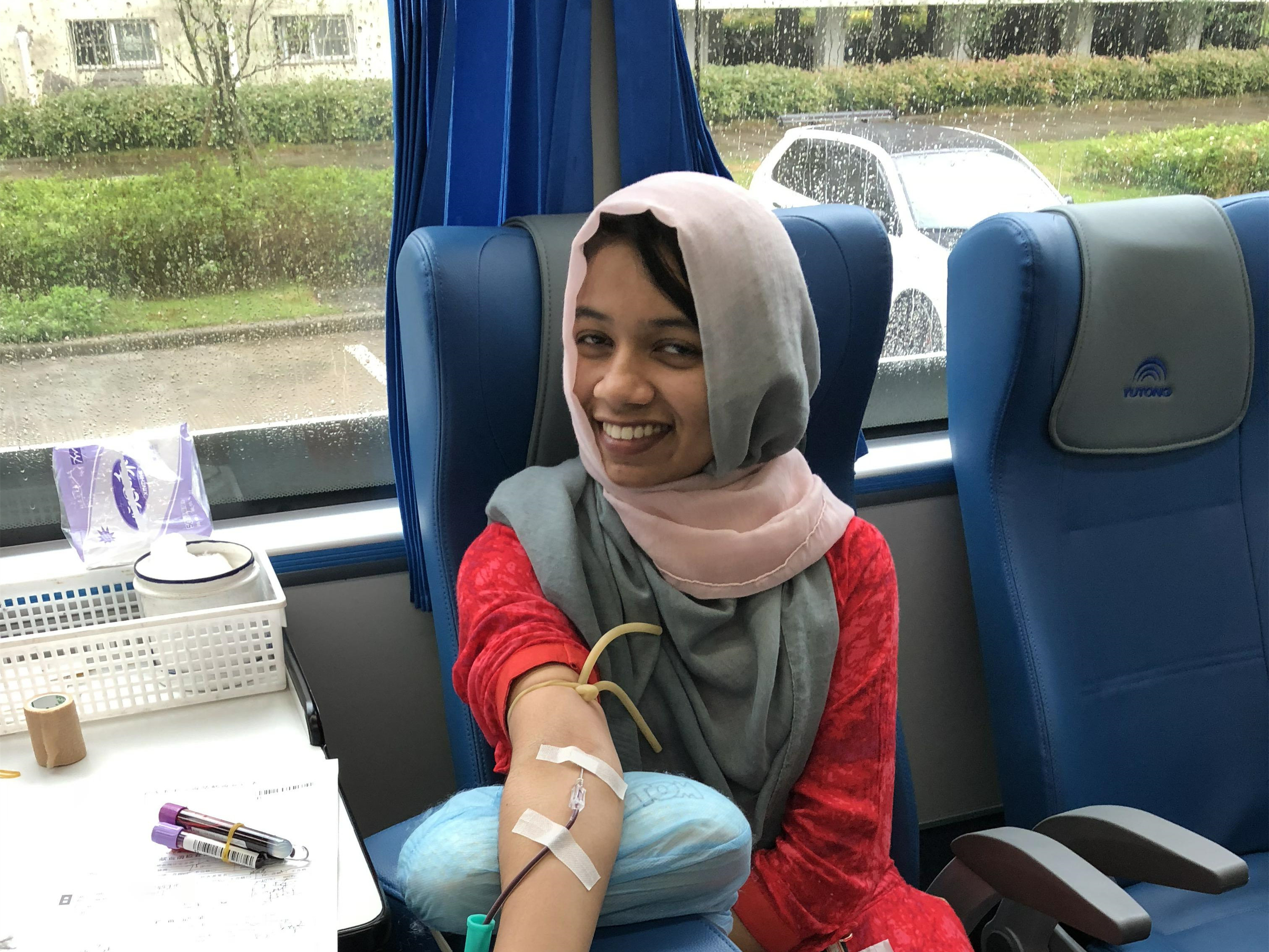 在献血现场,留学生们认真填写了表格,体检化验,并用简单的汉语与志愿者、工作人员进行着交流和询问。“我是第一次献血,有点紧张!”,“我想知道我的血型”,“我身体健壮,能不能多献一点?”留学生们的热情深深感染了大家,原计划3个半小时的活动也因为同学们的高涨热情延长了2个小时。这群来自世界各地的医学生用他们的涓涓热血温暖了在场的所有人。正逢立夏,校方为前来献血的留学生们准备了茶叶蛋,使他们在献血之余体验中国的传统习俗。