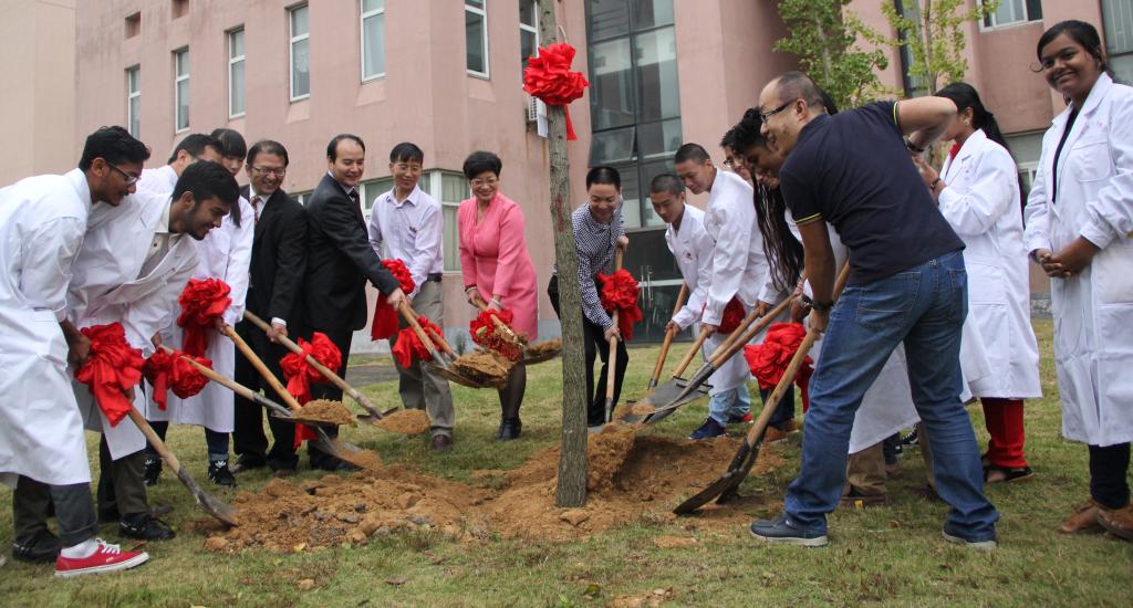 随着至真之门缓缓开启,最感人环节随之到来——“与会领导和嘉宾携新生代表走进至真之门”。师生共进至真之门,是激动,是喜悦,更是一份沉甸甸的医学使命,“博学守仁”的院训,从此铭刻在每一位新生的心中。最后与会领导和新生代表共赴杏林园,一起种下承载着医学初心的杏树,期待树根深扎于地下,蓬勃生长,就像医学院的新生,在新的环境中扎根发芽生长成参天大树。