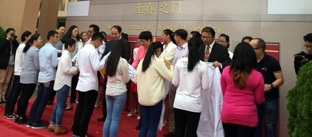 医学院执行院长周文华发表了激情洋溢的双语讲话。他希望医学生努力传承“兼容并包,自强不息,务实创新,与时偕行”的宁大精神,牢记“博学守仁”的医学院院训,勉励广大医学生担任起捍卫人类健康和生命的职责,铭记医学生誓言,努力学习理论知识和专业技能,做到真才实学,实现知识、能力、素质的全面提升。