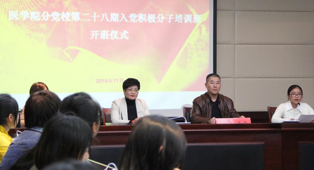 11月24日晚上,医学院分党校第二十八期入党积极分子培训班开班仪式在王长来楼二楼多功能厅举行。医学院党委书记骆巧凤、学工办相关老师和全体党校学员参加仪式,会议由学工办主任王磊主持。