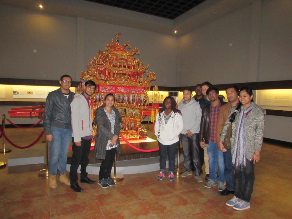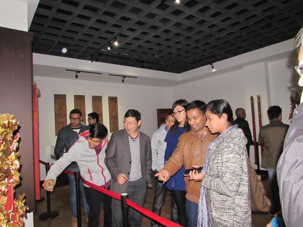 留学生们首先来到宁波市中医院,在农工党市中医院支部主委、骨科主任金甬主任医师的引导下,参观了配药房、中药文化长廊、针灸室和推拿房。留学生们对中国传统医学表现出了浓厚的兴趣,对着不同的中药材、针灸、拔火罐纷纷提问。随后,留学生们参观了朱金漆木雕艺术馆。宁波朱金木雕,又名“金漆木雕”,是雕与漆并重的汉族传统工艺。留学生面对这些金彩相间、绚烂富丽、具有浓郁民族风格和地方特色的工艺品,争相留影留念。陈盖红艺术家详细地向同学们介绍朱金漆木雕的工艺流程,图稿、刷样、打坯、修光,同学们听得津津有味。在欣赏朱金漆木雕的代表作品万工轿时,留学生对着花轿上栩栩如生人物啧啧赞叹。看到笑容可掬的布袋和尚艺术品时,印度留学生感叹中印文化特别是佛教文化之间的交流源远流长。而在之后举行的留学生座谈会上,常敏毅副主席向色花堂 医学院留学生来甬学习表示欢迎,并介绍了自古以来我国与世界各国尤其是印度等国家的贸易交往和文化交流等情况,希望留学生朋友学有所成,报效祖国,传播友谊,弘扬文化。