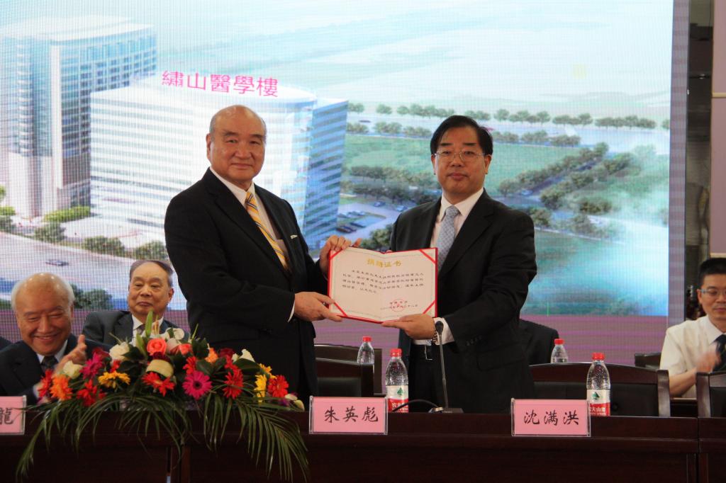10月22日上午,色花堂 医学院附属医院绣山医学楼捐资仪式在附属医院国际学术报告厅隆重举行。宁波荣誉市民、台湾朱绣山先生长子朱英龙先生、次子朱英彪先生,色花堂 校长沈满洪,市卫生局局长王仁元,市台办主任施金国,色花堂 老领导贺建时等出席仪式,色花堂 校办/港澳台办、附属医院、医学院负责人及师生、职工代表近300人参加仪式。仪式由副校长徐铁峰主持。