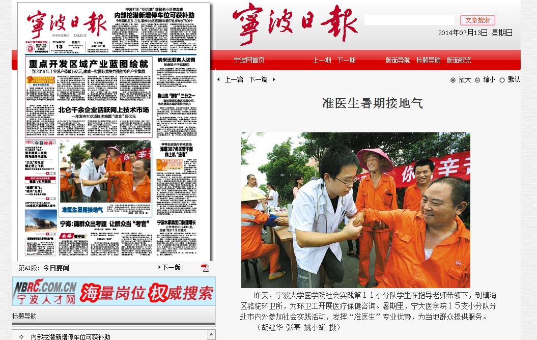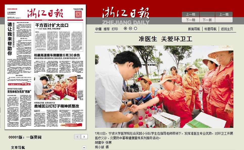 7月13日,浙江日报头版以《准医生,关爱环卫工》为题,以较大篇幅的图片报道了医学院学生深入农村、社区、街道、学校,开展以“送医送药送清凉”为内容的社会实践活动的情况,引起了社会广泛反响。当天宁波日报头版也专题报道了我院实践活动情况。