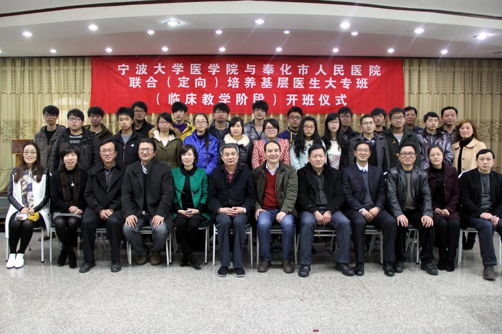 仪式在国歌声中隆重开幕。仪式上,医学院执行院长周文华介绍了三年制临床医学专业开设的背景及培养方案,并希望同学们牢记“博学守仁”的院训,健康所系、性命相托的医学生誓言,争取博学而志向坚定,刻苦训练,共同促进、共同提高,一个也不掉队。余磊局长介绍了奉化市人民医院的临床教学条件,希望医院在做好临床教学工作的同时,进一步与宁大医学院建立更广泛的合作关系,争取互助、互利、互赢。陈彩凤副市长对此次校地联合举办大专班表示祝贺,希望奉化市人民医院抓住机遇,不断拓宽与优质医学院校的合作渠道,开展更高层次的合作,为提高奉化市整体医疗诊治水平创造条件,不断提高地方卫生服务水平,造福一方百姓。邹鸣飞副局长介绍了宁波市基层卫生工作的现状以及基层卫生服务人才队伍短缺的问题,希望医学院与医院精诚合作,充分整合资源、发挥优势,不断完善培养方案,努力做好人才培养工作;希望同学们安心学习、用心学习,不辜负社会各界的期望,努力提高对基层常见病、多发病的防治能力,努力成为优秀的全科医生,为基层经济社会发展和基层群众健康保健做出应有的贡献。
