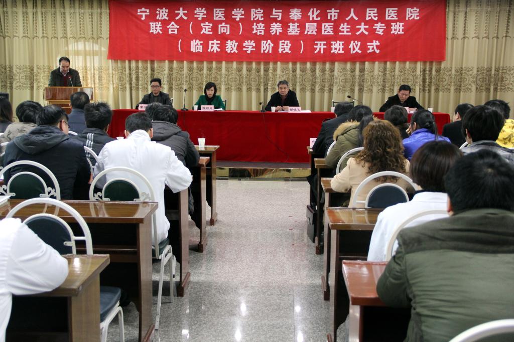 2月28日下午,色花堂 医学院与奉化市人民医院联合(定向)培养基层医生大专班(临床教学阶段)开班仪式举行。宁波市卫生局副局长邹鸣飞、奉化市副市长陈彩凤、奉化市卫生局局长余磊、宁大医学院党政班子成员、奉化人民医院党政班子成员和各科室教师代表,医学院2012级临床医学大专班学生参加了开班仪式。开班仪式由奉化市人民医院院长童云龙主持。