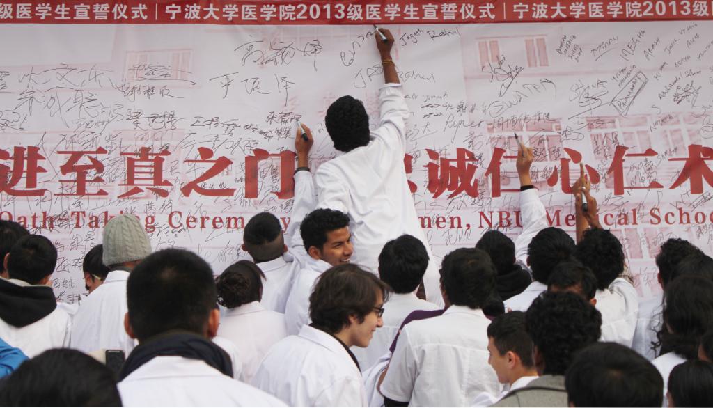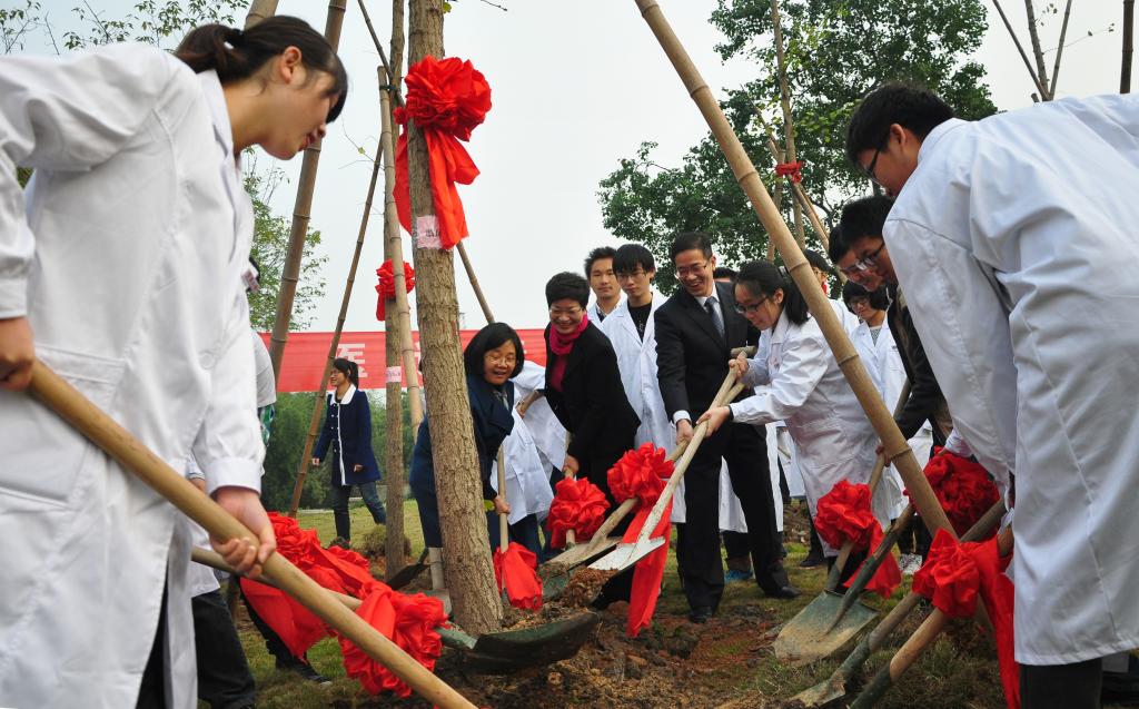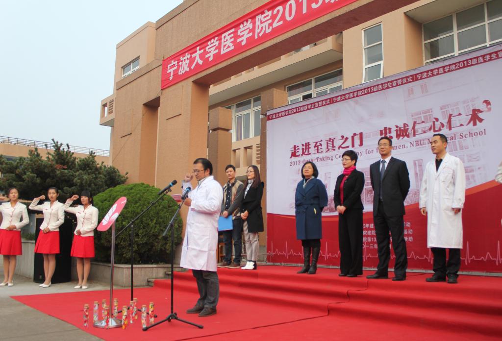 在师生齐唱《色花堂 医学院院歌》的昂扬歌声中,现场领导嘉宾为新生代表授予白大褂。全体医学生身着圣洁的白大褂,在医学院王钦文副院长的带领下,进行了庄严的宣誓,郑重地把“健康所系、生命相托”的神圣使命担在肩上,立志做有担当的新一代医学生。教师代表刘爱明博士,医学院首届毕业生、鄞州人民医院心内科医生赵乾磊,以及新生代表顾凯波、留学生新生代表Ahmad Harb,围绕“当我第一次穿上白大褂”进行了主题演讲。师长结合自身的经历、现代医学的发展和当前医疗环境的变化,与同学们分享了各自的“白衣情结”,鼓励大家珍惜时间懂得爱,鞭策同学们无论何时何地都要坚守自己的誓言,坚守生命和健康。在“杏林寄语”环节,国际合作处陈玉涓处长、医学院骆巧凤书记、孙欢欢副书记等领导嘉宾为2013级中外新生送上了深切的勉励和祝福。医学院徐雷艇副院长发表了热情洋溢的讲话,他希望同学们既要传承“兼容并包,自强不息,务实创新,与时偕行”的宁波精神,更要牢记“博学守仁”的院训,勉励广大医学生要担任起捍卫人类健康和生命的职责,铭记医学生誓言,努力学习理论知识和专业技能,做到真才实学,实现知识、能力、素质的全面提升。最后,全体领导嘉宾来到王长来楼东侧草坪,和各班学生代表一起植下象征医学界的银杏树,并埋下寓意希望和理想的时间囊,共同培植“杏林明志,医话青春”的梦想。