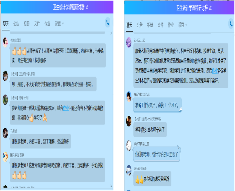 廖奇老师对卫生统计学授课做了很多探索,预习部分借助优质网络慕课和超星平台上自行录制的教学视频,给学生提供了许多优质和丰富的教学资源,并结合平台上每一章节的测验,帮助学生进行重点难点梳理。《卫生统计学》课程线上教学综合了超星学习通平台的在线作业、签到、问卷等功能、QQ群课堂的直播和互动功能、群交流功能,同时结合当下新冠病毒疫情的研究数据和文献,让整个课程设计更加生动、灵活、系统。课后通过在线作业督促学生对本章节内容的复习和学习效果的检测。另外,廖奇老师在授课的同时,通过录屏软件实时录制授课内容,即使课程结束后,学生也可以通过视频回放进行复习和巩固。