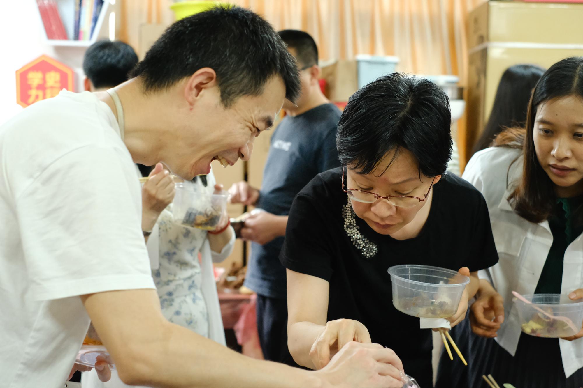现场的老师们有学包粽子的、用心包饺子的、耐心煮粽子的、细嚼慢咽品尝美食的……