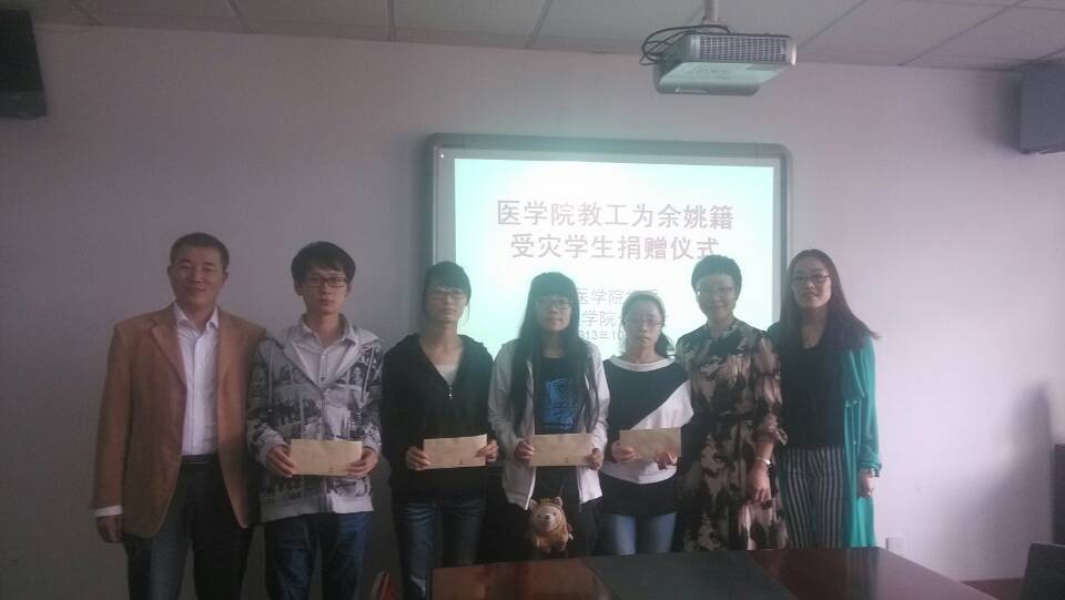 10月29日,医学院教工为余姚籍受灾学生捐赠仪式在学院王长来楼202会议室举行。院党委副书记、分工会主席孙欢欢,分工会副主席刘琼,院学工办主任王磊,院分团委书记姚小斌及该院4名余姚籍受灾学生参加了捐赠仪式。