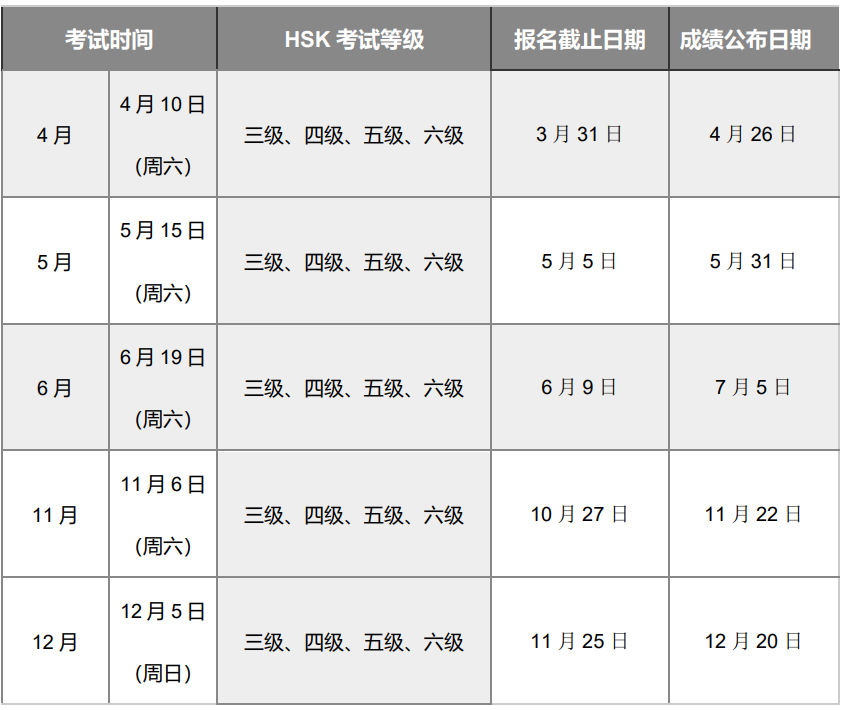 2021年HSK考试色花堂 考点各级考试安排如下所示。请要参加考试的学生们提前进行规划并及时登陆//www.chinesetest.cn进行网上报名。