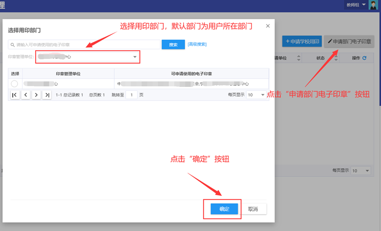1. 用户可进入信息门户,搜索"印章使用申请",点击进入"申请部门电子印章"模块,选择用印部门,如图所示: