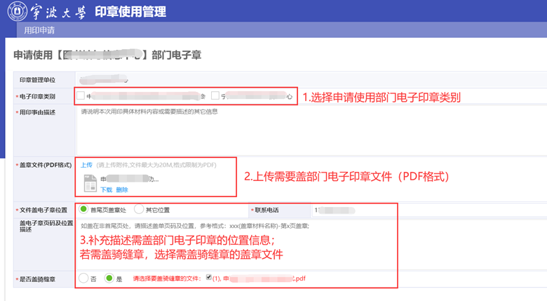 2.用户填写电子印章使用事由,并上传需要盖章的PDF文件,如图所示: