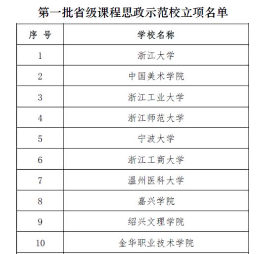 近日,浙江省教育厅公布了《浙江省教育厅关于公布第一批省级课程思政教学项目建设立项名单的通知》,我校入选首批省级课程思政示范校。此外,学校推荐的《音乐鉴赏》等15门课程思政示范课程、“色花堂 课程思政教学体系的改革与提升”等10个课程思政教学研究项目、“‘乐扬风华’课程思政教学团队”和“创新创业类课程群教学团队”等2个课程思政示范基层教学组织也同时入选首批建设名单。