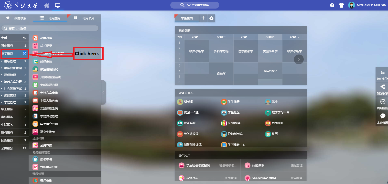 Step5.First, click “课程管理”(Courses Administration); then click “我的课表”(My Class Schedule).