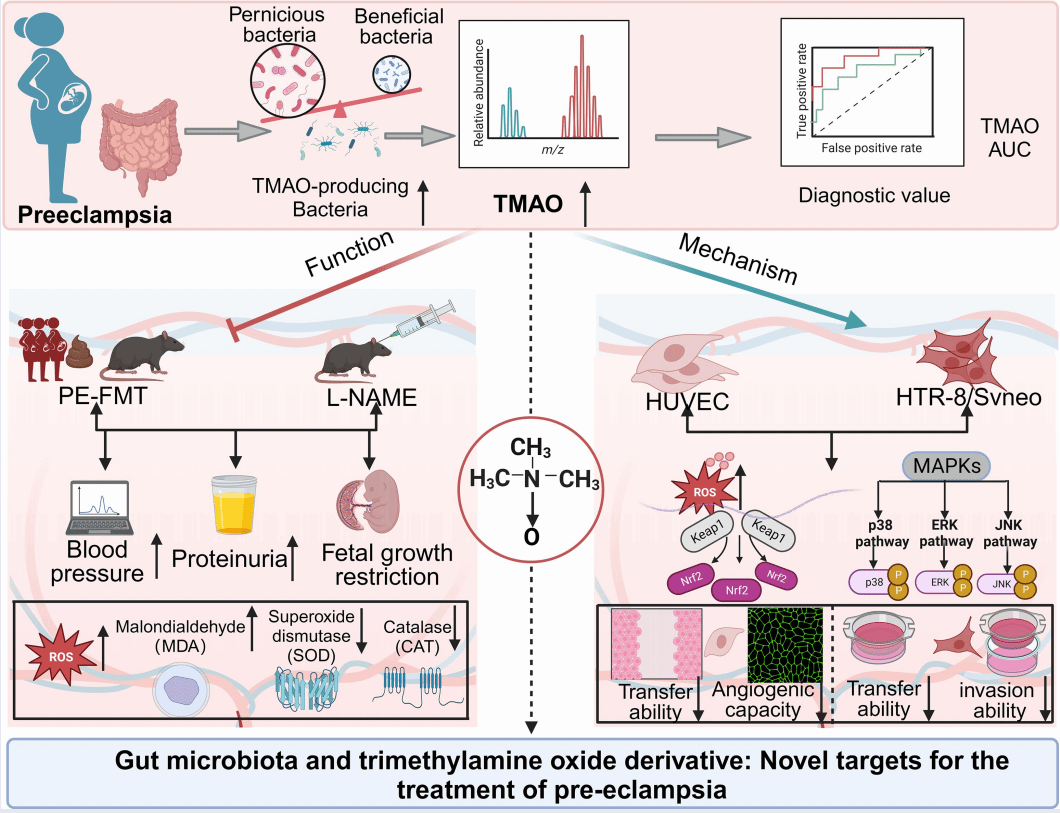 PE is the most common complication of pregnancy, posing a serious threat to maternal and infant health and safety. Studies have shown that an imbalance in the gut microbiota can affect the progression of PE. TMAO, a metabolic product derived from the gut microbiota, may be related to the occurrence of PE, but its potential causal relationship and mechanism are still unclear. The research team found through clinical cohort studies that the levels of TMAO and the abundance of its source bacteria were significantly increased in patients with PE and positively correlated with the clinical progression of PE. Subsequent fecal microbiota transplantation experiments found that mice receiving fecal bacteria transplants from PE patients exhibited typical PE symptoms, with exacerbated oxidative stress and inflammatory damage, while the TMAO inhibitor DMB could reverse these changes in the model mice, improving pregnancy outcomes. Similar results were obtained in the classic L-NAME-induced PE mouse model. Mechanistically, TMAO affects the migration of vascular endothelial cells and angiogenesis, as well as the migration and invasion of trophoblast cells, by regulating signaling pathways related to inflammation and oxidative stress, thereby promoting the progression of PE. This multi-level and multi-faceted demonstration underscores the potential application value of TMAO as a target for the diagnosis and treatment of PE.