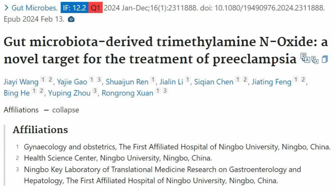 On February 13th, Wang Jiayi, a 2021-level master's student specializing in Obstetrics and Gynecology from the Medical Department, was the sole first author to publish a research paper titled "Gut microbiota-derived trimethylamine N-Oxide: a novel target for the treatment of preeclampsia" in the journal "Gut Microbes" (a top-tier SCI dual-zone journal with an impact factor of 12.2). The study revealed the role and mechanism of the gut microbiota and its derivative trimethylamine N-Oxide (TMAO) in the progression of preeclampsia (PE), providing new insights into the pathogenesis and therapeutic targets of PE. The corresponding author of the paper is the chief physician Xuan Rongrong from the First Affiliated Hospital's Department of Obstetrics and Dr. Zhou Yuping from the Ningbo City Key Laboratory of Gastroenterology and Hepatology Translational Medicine Research. The research was supported by funds from the Zhejiang Provincial Basic Public Welfare Program Youth Project, Ningbo City Science and Technology Major Tackling Key Project, Ningbo City Natural Science Foundation Key Project, and Ningbo City High-End Medical Team Major Tackling Key Project.