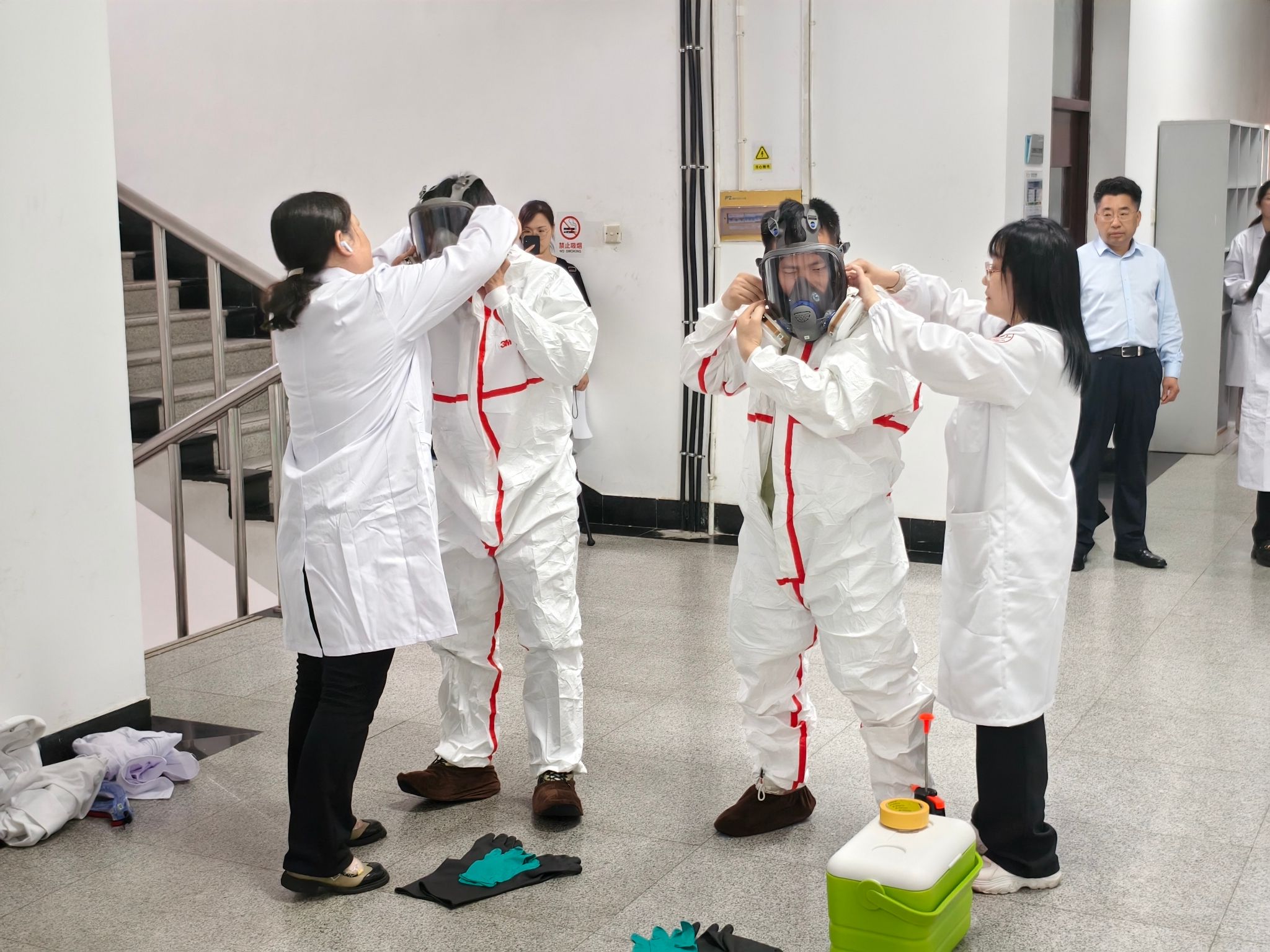 To enhance the level of biosafety protection and strengthen the emergency response capabilities for biosafety incidents, a "Laboratory Biosafety Emergency Drill" was held on May 31 at the Health Science Center. The event was organized by the University's Department of Assets and Laboratory Management, with collaboration from the Health Science Center. Zhang Chundan, the Deputy Director of the Department of Assets and Laboratory Management, and Xu Guozhang, the Deputy Director of the Health Science Center, were present to guide the exercises. Approximately 60 staff members from relevant functional departments and representatives of teachers and students from the Health Science Center participated in the live drill and watched the video broadcast.
