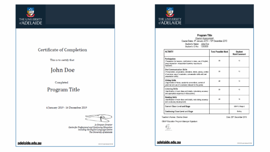 顺利完成所有课程,并通过学术考核的学生,将获得阿德莱德大学出具的正式成绩单及学习证明。